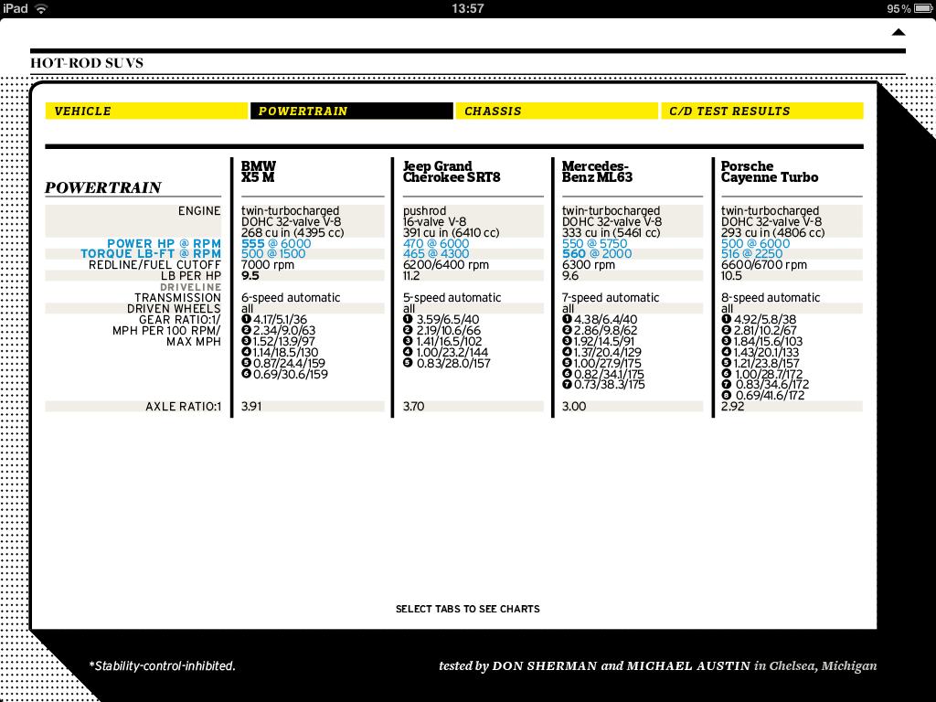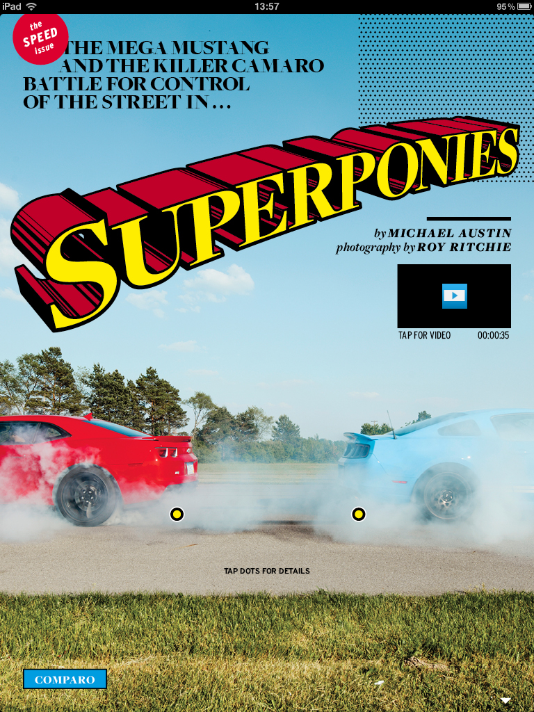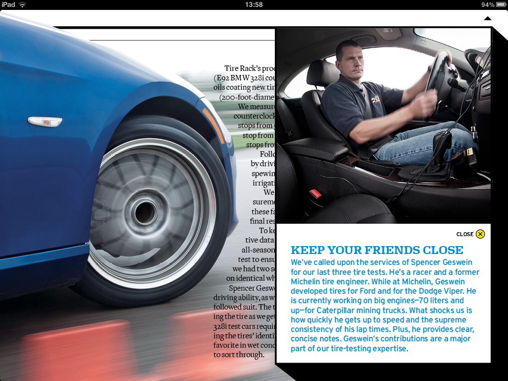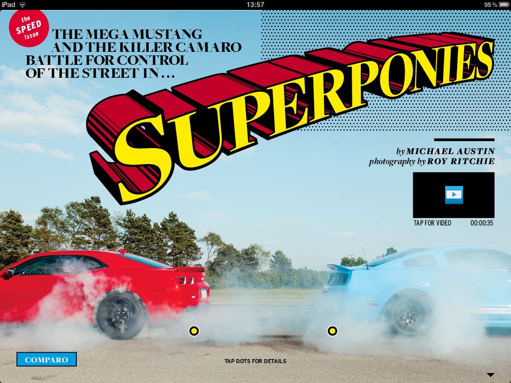 The print edition had three or more designers working on its layout and production. The iPad edition was the sole responsibility of Matthew J. Richards. More content needed to fit into less space. Photography, video, complex information graphics and charts, audio, embedded media from external sources, animations and copy needed to fit and needed to look good in both vertical and horizontal orientations.